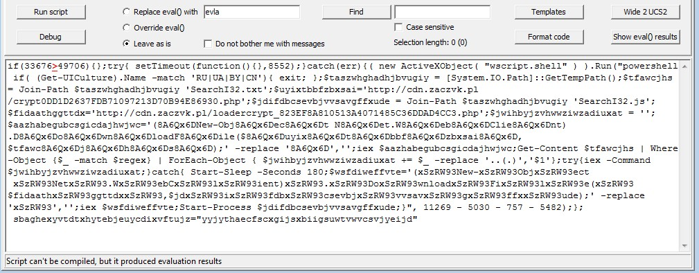 In addition to retrieving the data required to continue the infection process, the script also implements a Sleep cmdlet for 180 seconds then attempts to retrieve the latest obfuscated JavaScript that is hosted at the same URL that was referenced in Stage 1.