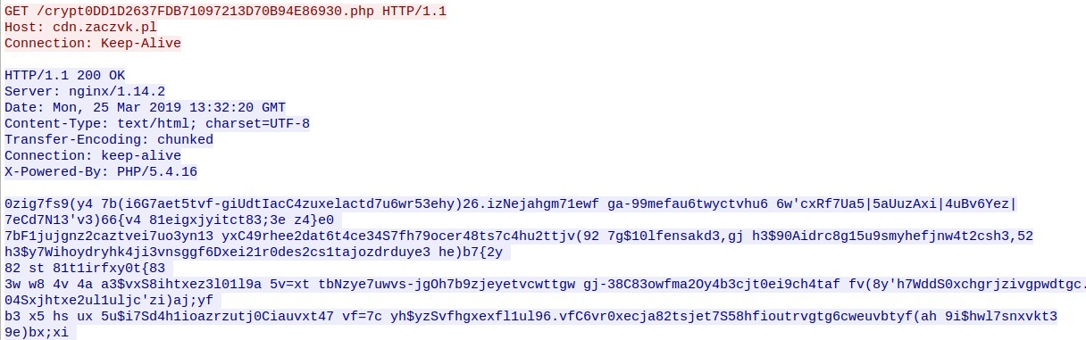 As previously mentioned, the malware makes an HTTP GET request to the following URL to obtain additional instructions from the attacker-controlled server: hxxp://cdn[.]zaczvk[.]pl/loadercrypt_823EF8A810513A4071485C36DDAD4CC3.php.